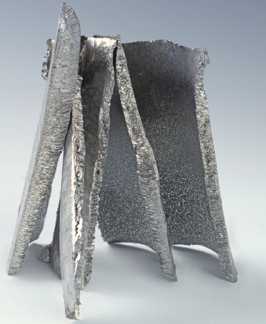 块状或针状结晶,呈银灰色金属光泽。