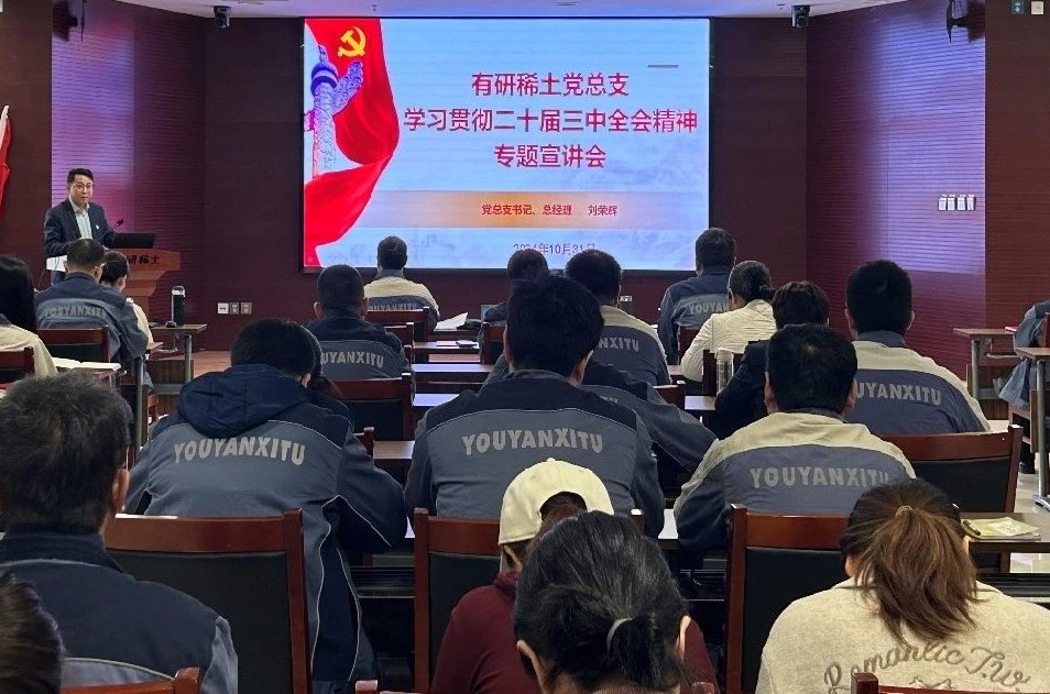 公司党总支书记、总经理刘荣辉介绍了党的二十届三中全会召开的时代背景和重大意义,学习传达《中共中央关于进一步全面深化改革、推进中国式现代化的决定》的主要内容,解读关于准确理解和把握进一步全面深化改革、构建支持全面创新体制机制、推动新质生产力发展等内容,并结合有研稀土产业发展实际,对党的二十届三中全会精神进行系统宣讲。