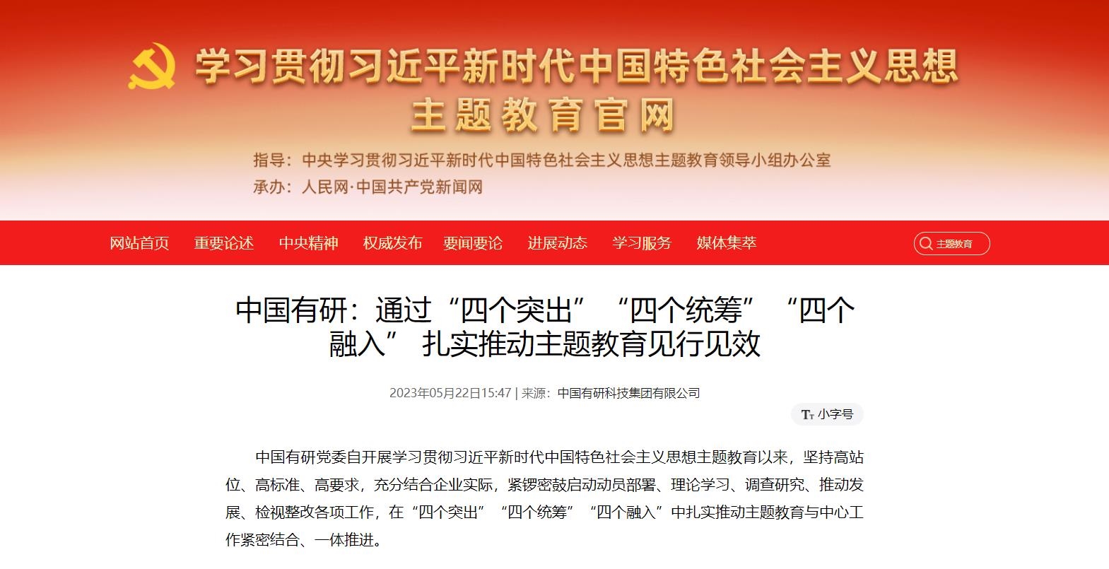 5月22日,国资委官网发布《中国有研:通过“四个突出”“四个统筹”“四个融入”,扎实推动主题教育见行见效》。