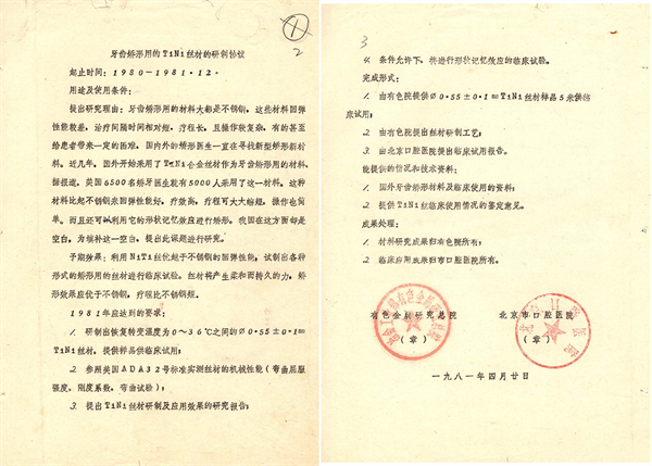 1981年有色金属研究总院与北京口腔医院研发第一支镍钛丝的合作协议