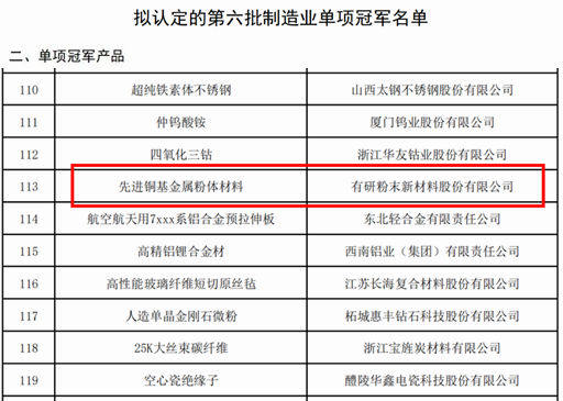 工信部日前公布了第六批制造业单项冠军及通过复核的第三批制造业单项冠军企业(产品),有研粉材榜上有名,“先进铜基金属粉体材料”入选制造业单项冠军产品名单。
