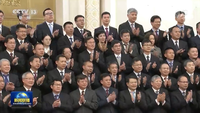 人民大会堂北大厅气氛喜庆热烈。上午10时许,习近平等党和国家领导同志步入会场,向参研参试人员代表挥手致意,全场响起经久不息的掌声。习近平同孙家栋、栾恩杰等亲切交流,并同大家合影留念。
