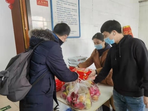 春节前夕,及时了解、解决研究生的困难和需求,创建了“2021留院过大年”和“过大年活动筹备”微信群。2月10日,牛慧贤、李苗苗、田沛三名老师到单身公寓走访慰问了节日期间留院研究生,为每一名留院过年的研究生送去水果、水饺等年货大礼包,并送上暖心问候和新春祝福,为丰富研究生的文娱生活,还向留院研究生发放了春节档电影券。
