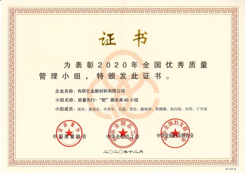 近日,从中国质量协会年会上传来喜讯,有研集团三级子公司有研亿金质量先行—“靶”握未来QC(质量控制)小组被中国质量协会、中华全国总工会、中华全国妇女联合会联合授予“2020年全国优秀质量管理小组”称号。